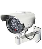 When placed outdoors the flashing LED light is powered by the sun and two rechargeable AAA batteries that are included with the camera. If you choose to use the camera indoors you can replace the included rechargeable batteries with 2 standard AAA batteries that are not included. When this camera is placed in or around your home or business even the most sophisticated criminals will think the premise is guarded by a high-tech surveillance system and go in search of an easier target. In fact, this is an actual surveillance camera that has been modified into a dummy or fake security camera. This unit does contain a flashing light. The camera features authentic video cable and a fully adjustable plastic mounting bracket that will let you install the camera quickly and easily using the included stainless steel screws. The dimensions (including the rain shield and bracket) are 10 x 6 x 7 inches.