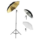 The umbrella is a great addition to your studio setup and works well to diffuse the light from any flash. The three umbrella provide multi purpose. The Silver reflective umbrella features a silver interior surface which provides a soft, but highly efficient bounced light source. For close-up lighting, the shoot through allowing you to get closer to the subject while lighting through the umbrella. The gold reflective provides warm soft, wrap around style lighting.